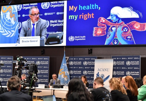 2024年12月10日,世界卫生组织总干事谭德塞在瑞士日内瓦世卫组织总部出席年度新闻发布会并讲话。(新华社记者连漪摄)