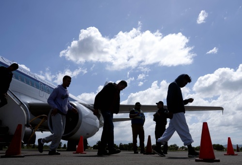 2月14日,在洪都拉斯西北部城市圣佩德罗苏拉的拉蒙·比列达·莫拉莱斯机场,返乡移民走下飞机。新华社发(戴维摄)