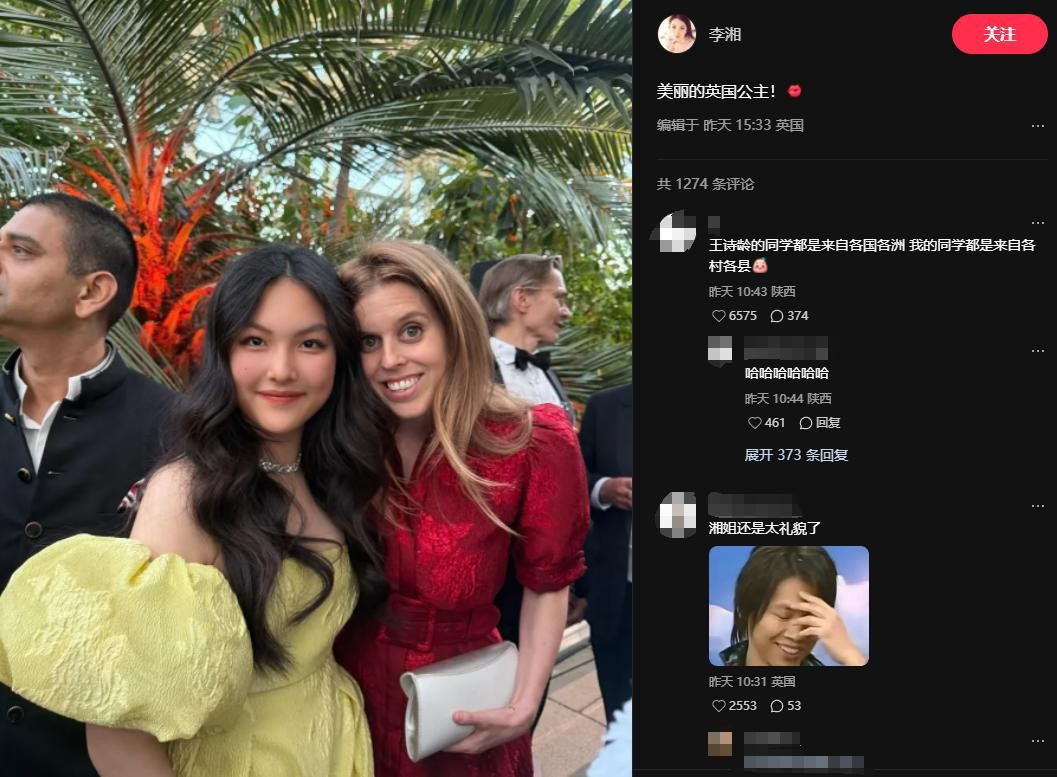 李湘配文“美丽的英国公主”,两人与英国皇室成员交谈,完美融入了普通人不敢奢望的圈子。