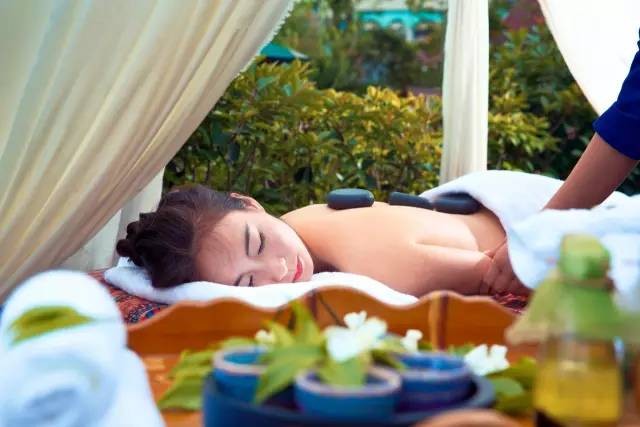 宋城云曼温泉内备有茶饮,还有一些保健按摩项目:比如推拿……泡累了,可以披上浴巾,吃着水果做按摩,让身体得到放松。