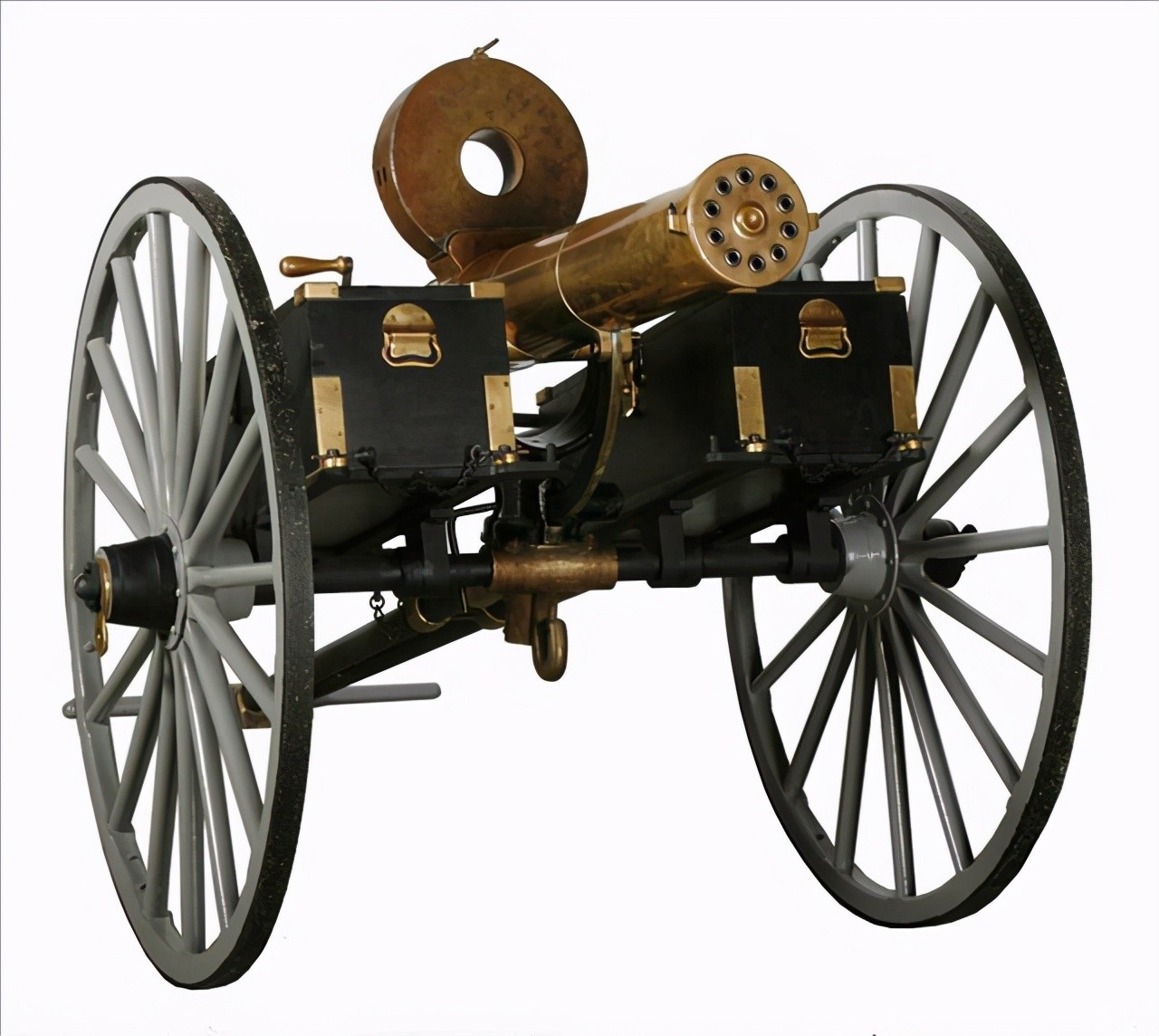 在1861年加特林发明了加特林手摇式多管机枪之后,又在后来的1865年对它做了一些改进,并且在1866年时装备给了美国陆军。