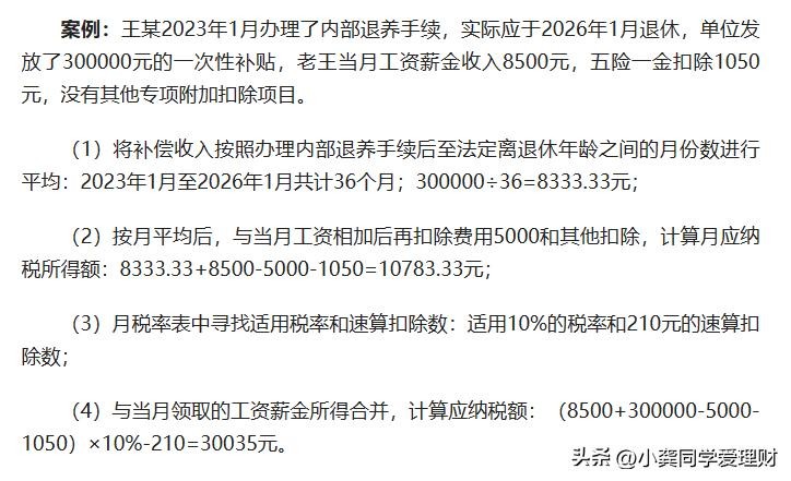 内部退养一次性补偿金个税计算案例