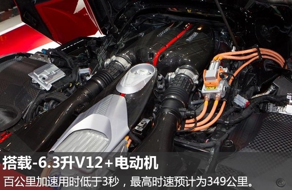 动力方面,LaFerrari搭载了由6.3升V12发动机和电动机组成的混动系统,其中发动机的最大输出功率为588千瓦,综合输出功率为708千瓦,匹配7速双离合变速箱,标配后驱,最高时速为349公里,百公里加速用时低于3秒。LaFerrari Spider敞篷版车型同样将延续硬顶版的动力配置,百公里加速用时同样小于3秒。