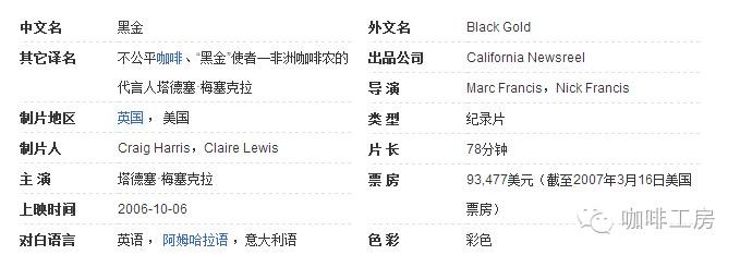 《黑金》是2006年上映的纪录片,由MarcFrancis、NickFrancis执导。该片通追踪咖啡商人塔德赛的脚步,揭示了咖啡世界以及如何从艰难生存的埃塞俄比亚咖啡豆种植者手中到消费者的咖啡杯中的咖啡交易过程。