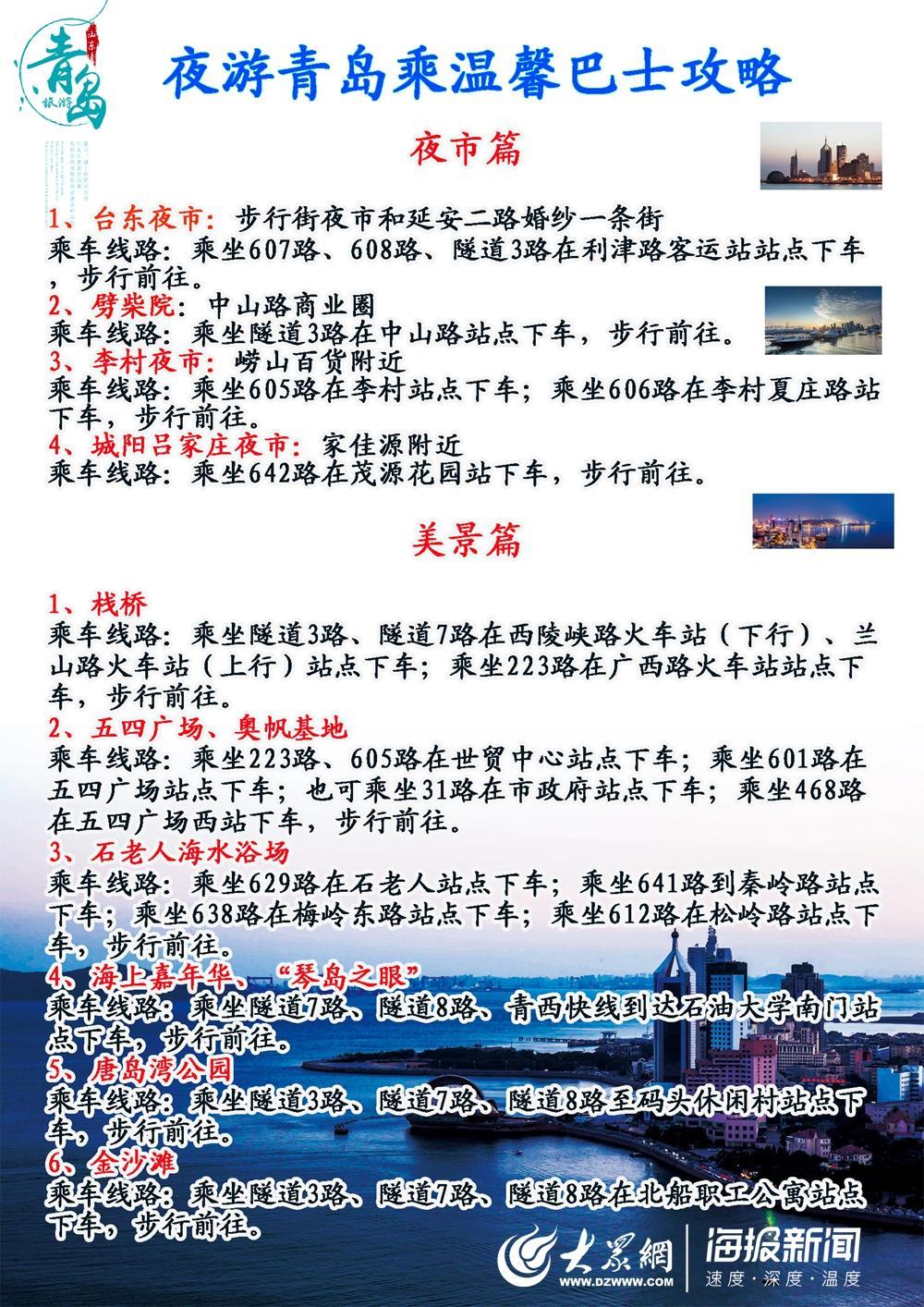 大众网·海报新闻青岛7月15日讯(记者 蒋甜 通讯员 江敏)上合(青岛)峰会后,青岛各方面发展再上新台阶,其中夜经济在今年以来迅速升温,“夜游”已然成了游客的“打卡新模式”。7月15日,大众网·海报新闻记者从交运温馨巴士获悉,为方便游客夜游青岛,温馨巴士特意绘制整理了一份“夜游青岛乘车攻略”,列举出青岛多处夜市、美景,标注了途经的公交线路。同时,温馨巴士途经城市主干道、居住区较为集中、通行条件较好区域的6条公交线路,运营时间季节性延时,途经夜市、美景线路也安排了夜间机动运力,随时应对客流高峰出现。